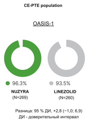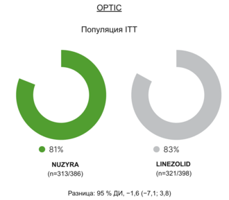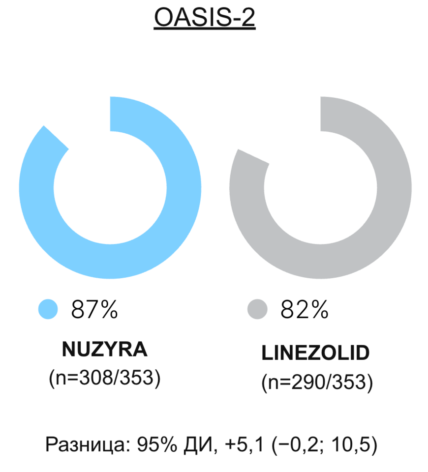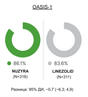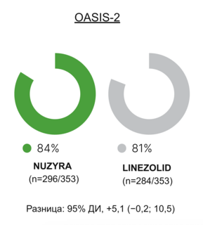 Литература: 1. NUZYRA [Инструкция по медицинскому применению]. Paratek Pharmaceuticals, Inc. 2. O’Riordan W, Green S, Overcash JS и др. Омадациклин для перорального применения один раз в сутки по сравнению с пероральным линезолидом два раза в сутки при острых бактериальных инфекциях кожи и кожных структур (OASIS-2): рандомизированное, двойное слепое, многоцентровое, контролируемое исследование III фазы на доказательство не меньшей эффективности. Lancet Infect Dis. 2019;19(10):1080–1090. 3. O’Riordan W, Green S, Overcash JS и др. Омадациклин при острых бактериальных инфекциях кожи и кожных структур. N Engl J Med. 2019;380(6):528–538. 4. Cornely OA, File TM Jr, Garrity-Ryan L и др. Безопасность и эффективность омадациклина для лечения внебольничной бактериальной пневмонии и острых бактериальных инфекций кожи и кожных структур у пациентов с лёгкой и умеренной почечной недостаточностью. Int J Antimicrob Agents. 2021;57(2):106263. 5. Pai MP, Wilcox MH, Chitra S, McGovern PC. Безопасность и эффективность омадациклина в зависимости от категорий индекса массы тела и наличия сахарного диабета в анамнезе в двух рандомизированных исследованиях II фазы у пациентов с острыми бактериальными инфекциями кожи и кожных структур. J Antimicrob Chemother. 2021;76(5):1315–1322. 6. Stets R, Popescu M, Gonong JR и др. Омадациклин для лечения внебольничной бактериальной пневмонии. N Engl J Med. 2019;380(6):517–527. 7. Pai MP, Wilcox MH, Chitra S, McGovern P. Безопасность и эффективность омадациклина в зависимости от индекса массы тела у пациентов с внебольничной бактериальной пневмонией: субанализ рандомизированного контролируемого исследования. Respir Med. 2021;184:106442. 8. Torres A, Garrity-Ryan L, Kirsch C и др. Омадациклин по сравнению с моксифлоксацином у взрослых пациентов с внебольничной бактериальной пневмонией. Int J Infect Dis. 2021;104:501–509.