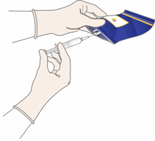 • Немедленно (в течение 1 часа) наберите 5 или 10 мл восстановленного раствора и дополнительно разведите до 100 мл (номинальный объем) 0,9% раствора натрия хлорида для инъекций USP или 5% раствора декстрозы для инъекций USP.